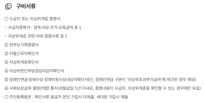 - 소득 요건: 기초생활수급자 및 차상위계층에 해당하는지 확인.