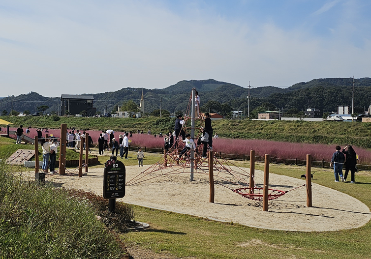 정원 내부는 꽤 넓고, 곳곳에 앉아 쉴 수 있는 공간도 마련되어 있어 천천히 둘러보며 시간을 보내기 좋습니다. 특히 핑크뮬리와 함께하는 경치를 배경으로 한 벤치는 인기 있는 포토존 중 하나입니다. 이곳에서 가족, 연인, 친구와 함께 사진을 찍으며 추억을 쌓아 보세요. 아이들을 위한 놀이터도 있어서 아이들이 좋아합니다.