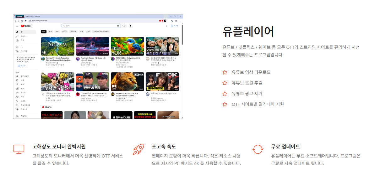 유플레이어는 유튜브를 광고 없이 감상하고, 영상과 음원을 고화질로 다운로드할 수 있는 무료 미디어 플레이어 겸 브라우저 기반 프로그램입니다.