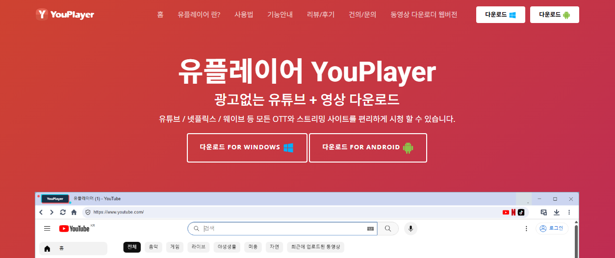 주로 윈도우 PC에서 사용되며, 별도의 설치 없이 웹사이트(youplayer.co.kr)에서도 바로 이용할 수 있어 접근성이 매우 뛰어납니다.
