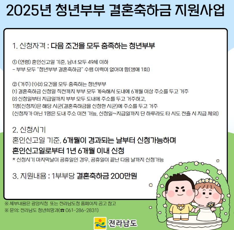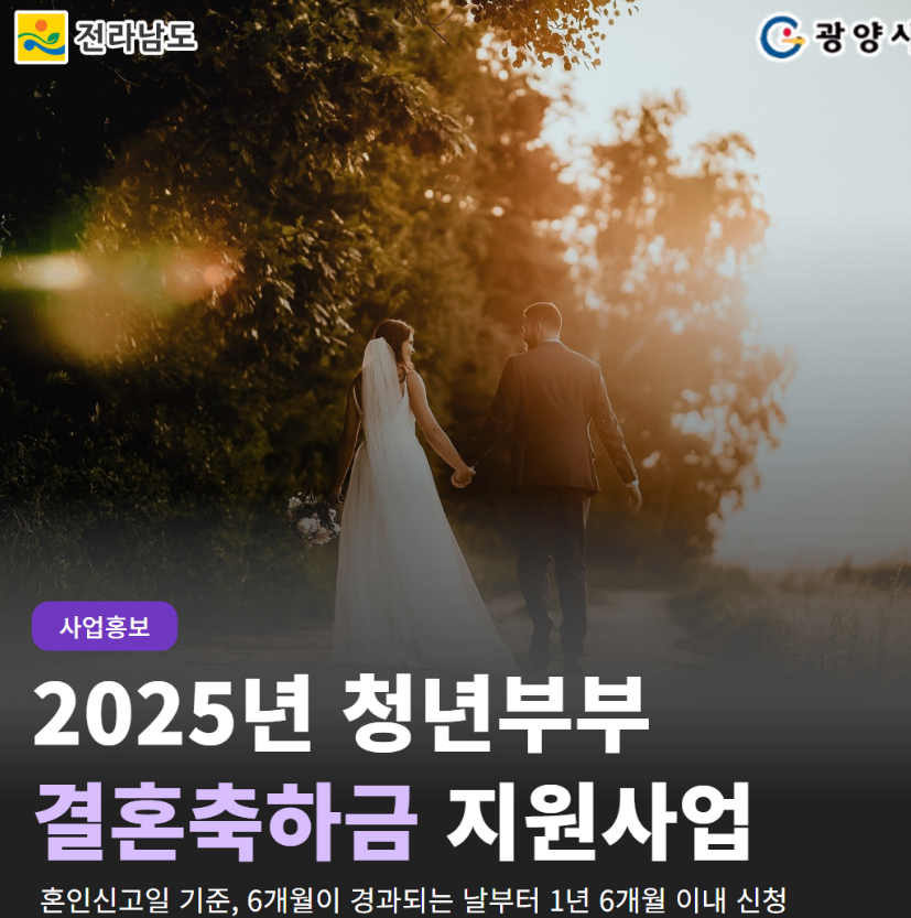 - 거주 요건: 혼인신고 이후 부부가 모두 전라남도 내에 6개월 이상 거주해야 하며, 부부 중 최소 한 명은 광양시에 주소를 두고 있어야 합니다.