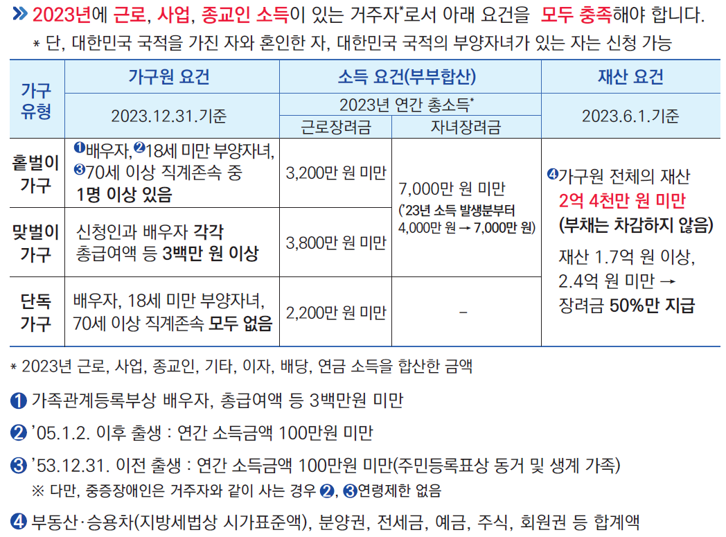 - 맞벌이가구: 배우자와 함께 살며 서로 소득이 있는 가구를 말해요. 이 경우에도 소득 기준을 충족해야 해요.
