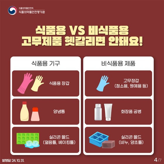 다가오는 김장철을 앞두고 많은 분들이 각종 조리기구와 용기를 준비하고 계실 텐데요, 식품용 고무제품을 올바르게 선택하는 것만으로도 건강과 안전을 지킬 수 있다는 점, 꼭 기억하세요. 비식품용 제품을 잘못 사용하면 몸에 해로운 물질이 음식에 섞여 들어갈 수 있으니 주의가 필요합니다.