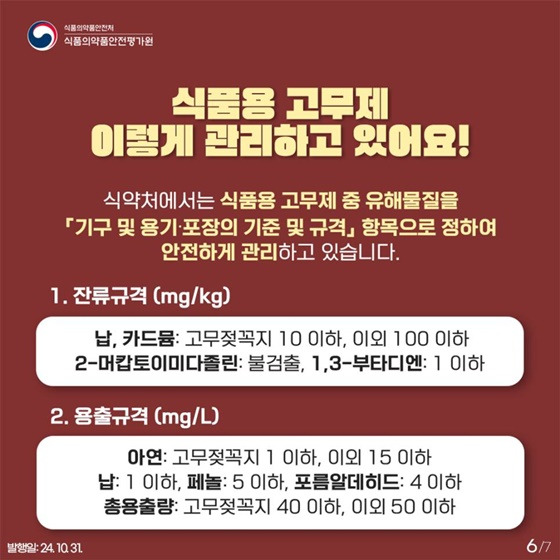 우리의 건강을 보호하기 위해 식품의약품안전처(식약처)에서는 식품용 고무제 기구와 용기에서 나올 수 있는 유해물질을 "기구 및 용기·포장의 기준 및 규격" 항목으로 정해 관리하고 있어요. 이 규정을 통해 고무제품을 사용할 때 발생할 수 있는 위험 요소를 줄이고 안전하게 사용할 수 있도록 하고 있습니다.