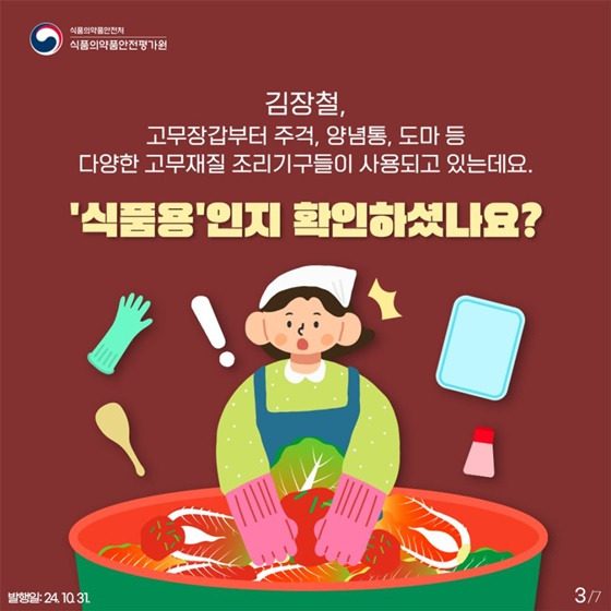 여기까지 고무제 기구·용기의 올바른 선택 요령과 안전 사용법에 대해 알아보았어요. 이번 김장철, 더 안전하고 건강하게 준비해 보세요
