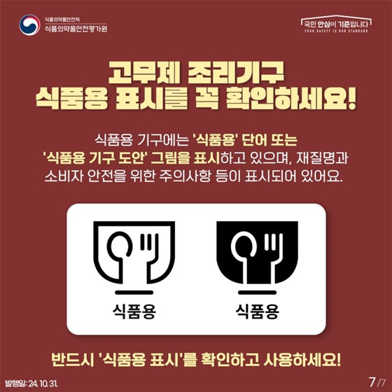 모든 식품용 고무제 기구에는 '식품용'이라는 단어 또는 '식품용 기구 도안'이 표시되어 있어요. 이를 확인하지 않고 사용하면 안전에 문제가 생길 수 있으니 꼭 확인하세요.