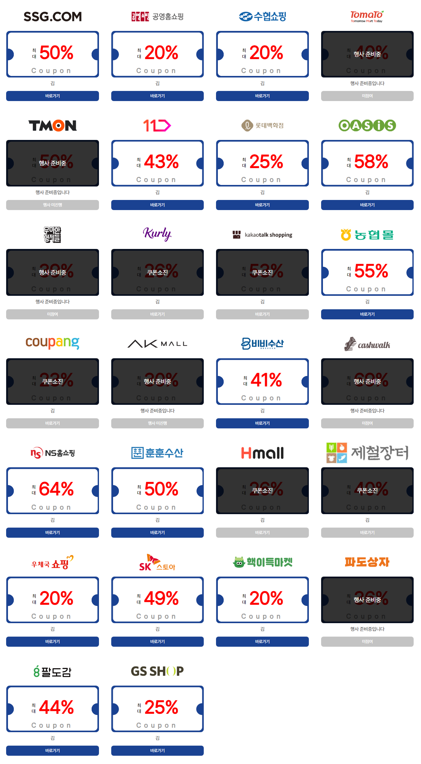 이번 행사는 오프라인 매장 18곳과 온라인몰 23곳에서 진행되며, 총 41개의 업체가 참여해요. 이 중 오프라인 매장으로는 롯데마트, 이마트, 홈플러스 등 주요 대형 마트들이 참여하고 있어요. 또한, G마켓, 쿠팡, 11번가 같은 주요 온라인몰에서도 혜택을 누릴 수 있어요. 참여 업체별 행사 기간과 세부 할인 품목은 대한민국 수산대전 공식 누리집(www.fsale.kr)에서 확인할 수 있으니, 꼭 확인해 보세요!