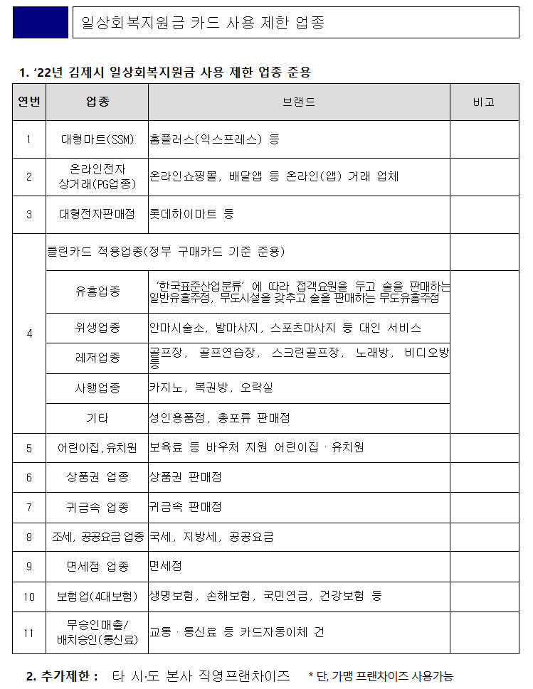 - 사용 제한: 발급된 카드는 김제시 내 모든 상가에서 사용 가능하지만, 대형마트, 유흥업소, 직영 프랜차이즈 등 일부 상가는 사용이 제한됩니다.