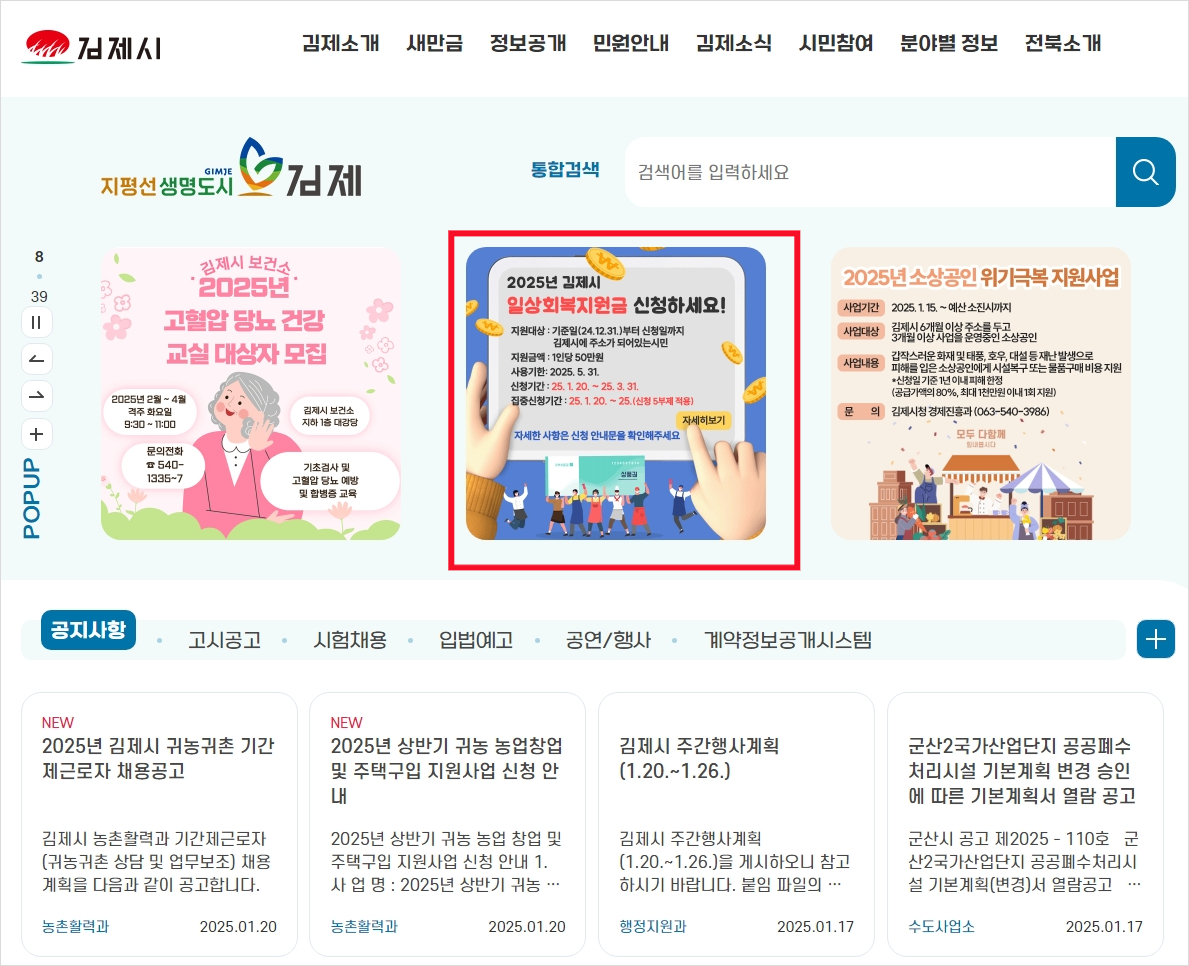 김제시, 2025년 설 연휴 전에 시민 1인당 50만 원 일상회복지원금 지급 계획 발표