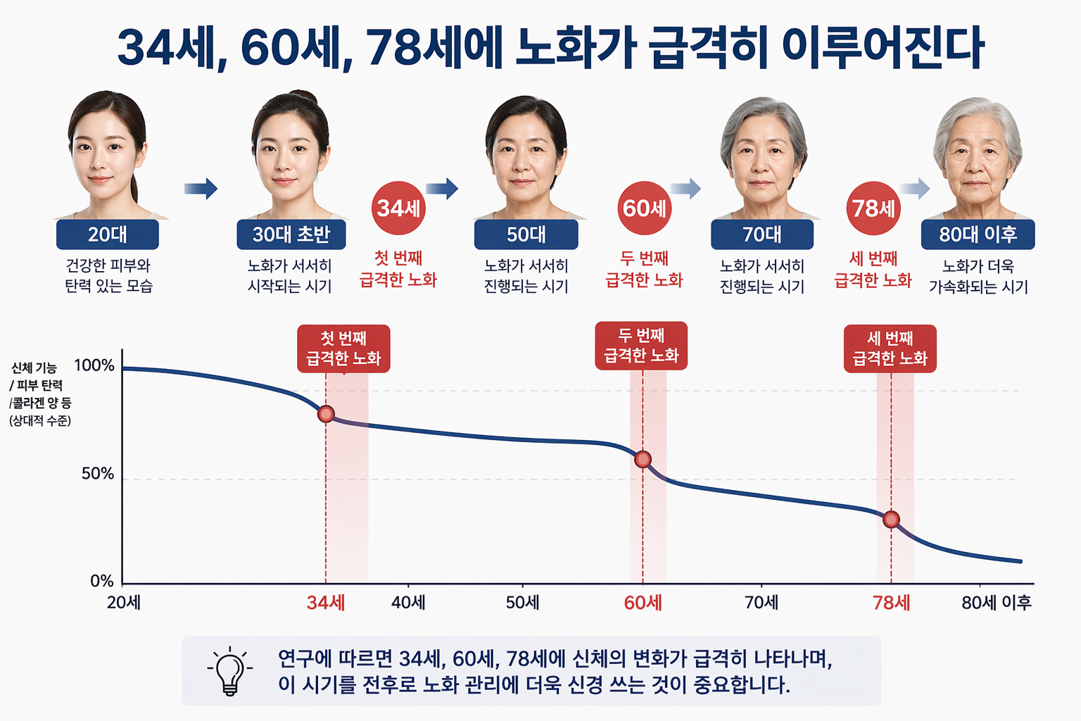 노화가 시작되었다고 슬퍼하기엔 이릅니다. 우리가 어떻게 관리하느냐에 따라 34세의 변곡점을 완만하게 넘길 수 있습니다.