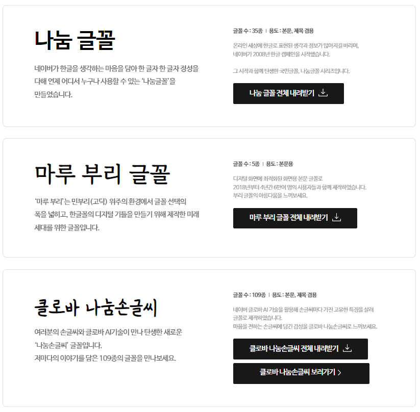 네이버는 개인 및 기업 사용자를 위해 다양한 무료 폰트를 제공하고 있습니다.