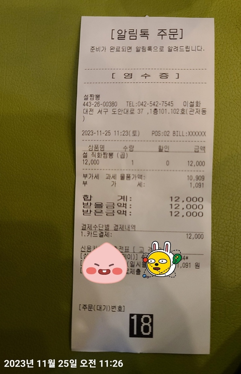 매운 음식을 좋아하는 저는 두번의 실패끝에 세번째로 설짬뽕 집을 예약하게 되었습니다. 대표음식인 짬뽕 곱빼기를 주문하고 10여분 기다렸을 때 알림톡이 도착하고 시식을 해보았습니다. 역시 명불허전, 가득한 부추와 꼬막, 돼지고기와 빨간색 국물은 입맛을 돋구었고 순식간에 국물만 남기고 다 먹었습니다.