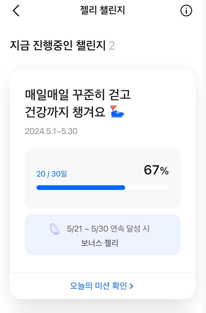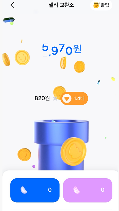 매일매일 미션을 달성하면 젤리를 줍니다. 젤리는 하루에 10-20원 사이의 돈이 들어와요