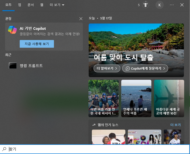 - 검색 창 열기: 윈도우 키 + S 또는 윈도우 키 + F