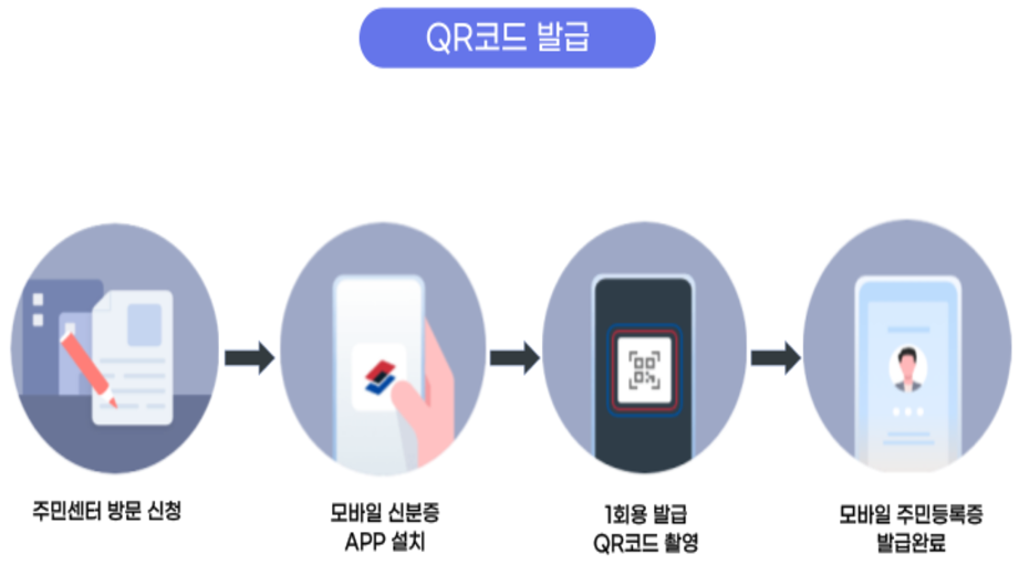 - 1회용 발급 QR코드 촬영: 주민센터에서 받은 QR코드를 앱에서 촬영합니다.