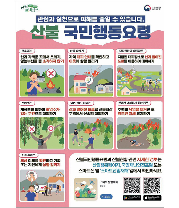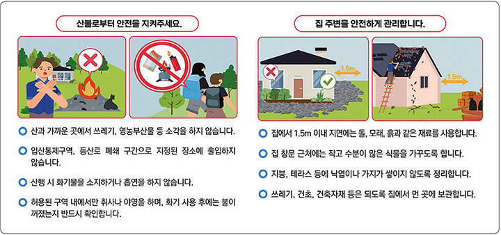 산불은 예방이 최선의 대응입니다. 내가 조심하고, 내가 막으면, 모두의 삶이 지켜집니다. 특히 봄철은 건조하고 바람이 강해 작은 불씨도 걷잡을 수 없이 커지기 쉬운 계절입니다.