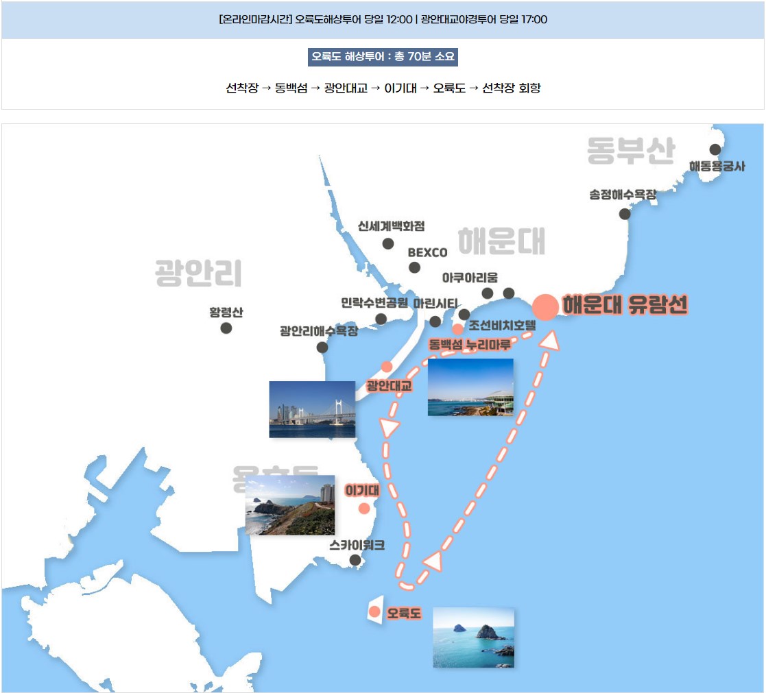 투어 예약: 해운대유람선 홈페이지 온라인 예약 또는 승성당일 현장을 통해 출항시간 확인(051-742-2525)