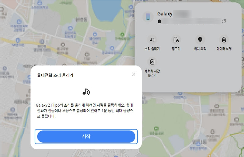 - 지도에서 연결된 기기 목록 확인 → 분실한 휴대전화 선택.