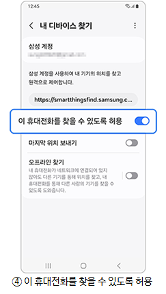 - "이 휴대전화를 찾을 수 있도록 허용" 토글 버튼을 ON으로 변경.