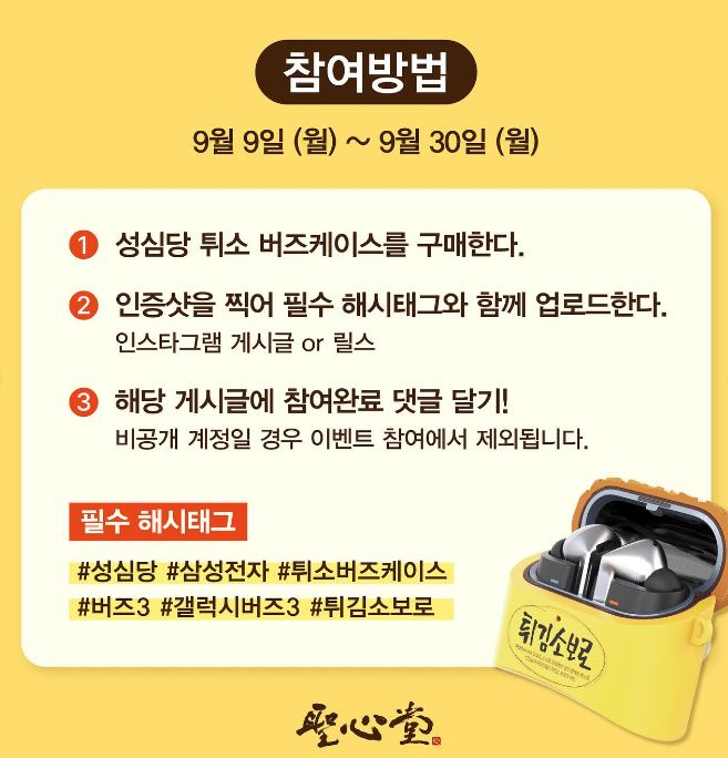성심당은 이번 케이스 출시를 기념해 SNS 구매 인증 이벤트도 진행 중이에요. 9일부터 이달 말일까지 튀김소보로 케이스를 구매하고, SNS에 인증 게시글을 올리면 100명을 추첨해 성심당 3만 원 상품권을 증정한다고 합니다. 성심당의 빵과 디저트를 사랑하는 분들에게는 정말 좋은 기회죠! 참여 방법도 간단하니, 튀김소보로 케이스를 구매한 분들은 꼭 참여해보세요.