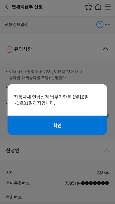 - 본인 명의의 차량 중 연납을 신청할 차량을 선택하고, 필요한 정보를 입력합니다.