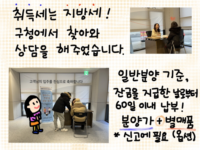 - 입주 후 ‘찾아가는 지방세 상담 창구’를 통해 담당 공무원에게 생소한 주택 취득세 납부 절차와 계산 방법에 대해 자세히 설명을 요청하면 많은 도움을 받을 수 있습니다.