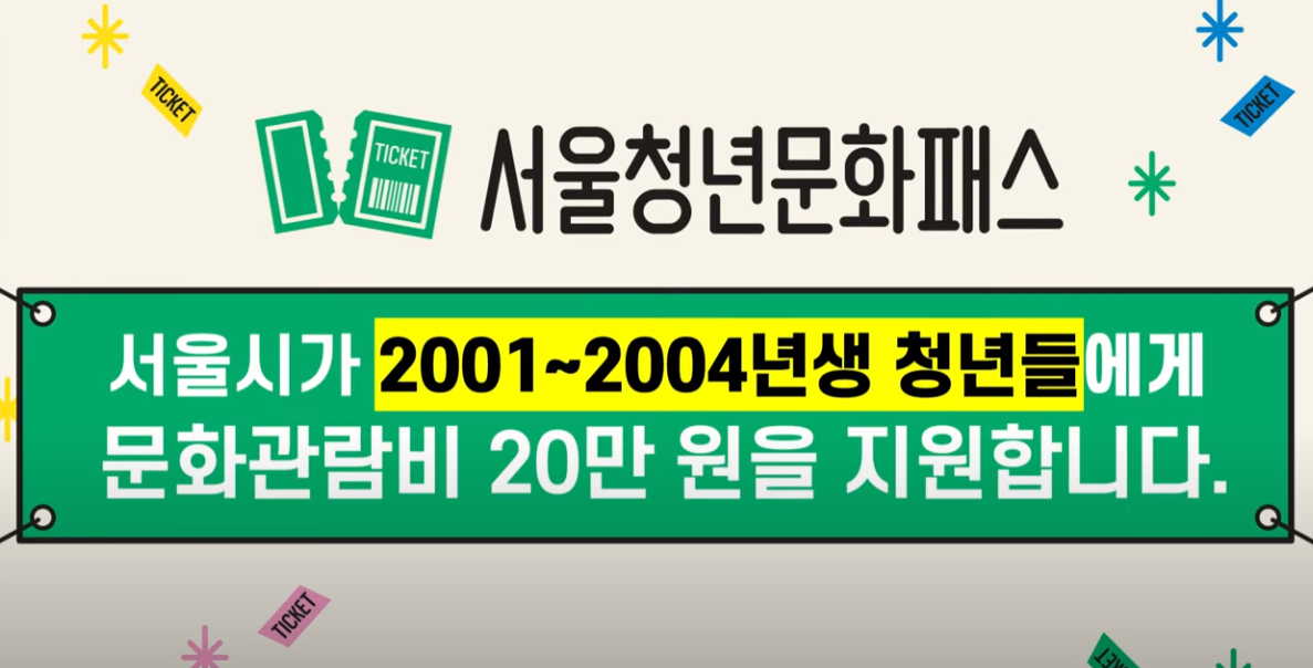 | 서울시가 2001~2004년생 청년들에게 문화관람비 20만 원을 지원합니다. 연극, 뮤지컬, 무용, 클래식, 국악 서울시가 청년들에게 공연 관람비 20만원을 지원합니다! 서울청년문화패스란? 공연 및 전시 관람 기회를 지원하는 문화이용권 사업 선순환 도모 -청년: 능동적 문화향유, 잠재적 관객 발굴 → 관람(수요) -예술계: 소비 활성화, 창작 활성화 → 창작(공급) 신청기간: 2024년 3월 28일(목)~4월 17일(수) 청년몽땅정보통 홈페이지에서 신청! 20세부터 23세까지 넓어진 혜택! 20만 원으로 공연·전시 마음껏 보자! 동행 매력 특별시 서울 |