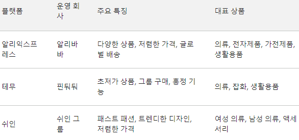 - 쉬인: 여성 의류 중심의 패스트 패션 플랫폼이며, 트렌디한 디자인을 저렴한 가격에 제공합니다.