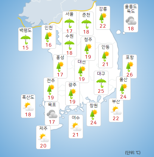 - 5월 5일 일요일: 흐리고 오후부터 비가 올 것으로 예상됩니다. 최고 기온은 24도, 최저 기온은 17도입니다.