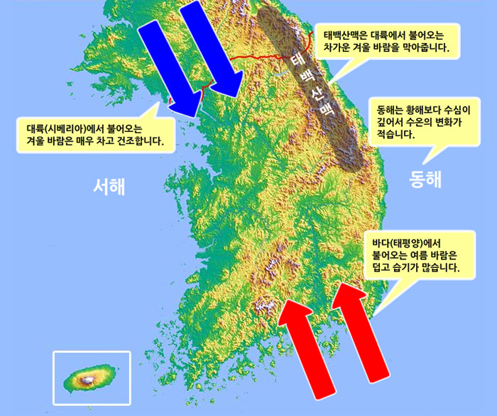 우리나라의 지형적 특성도 기온 차이를 크게 만드는 주요 원인 중 하나입니다.