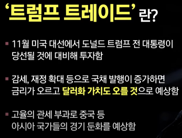 이 현상은 주로 법인세 인하, 인프라 투자 확대, 규제 완화, 보호무역주의 등 트럼프의 경제 정책에 대한 기대감과 그에 따른 투자자들의 반응을 반영합니다. 이러한 정책들은 경제 성장을 촉진할 것이라는 전망을 낳았고, 그 결과 금융 시장은 크게 반응했습니다.