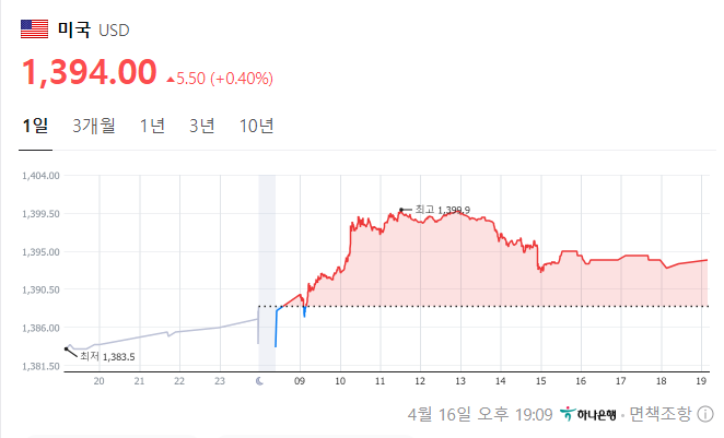2024년 4월 16일 오늘 기준, 원달러 환율은 1400.00원으로 거래되고 있습니다. 이는 지난 2022년 11월 8일 이후 약 1년 5개월 만에 돌파한 수치입니다. 최근 급격한 환율 상승세는 다음과 같은 주요 요인으로 인해 발생했습니다.