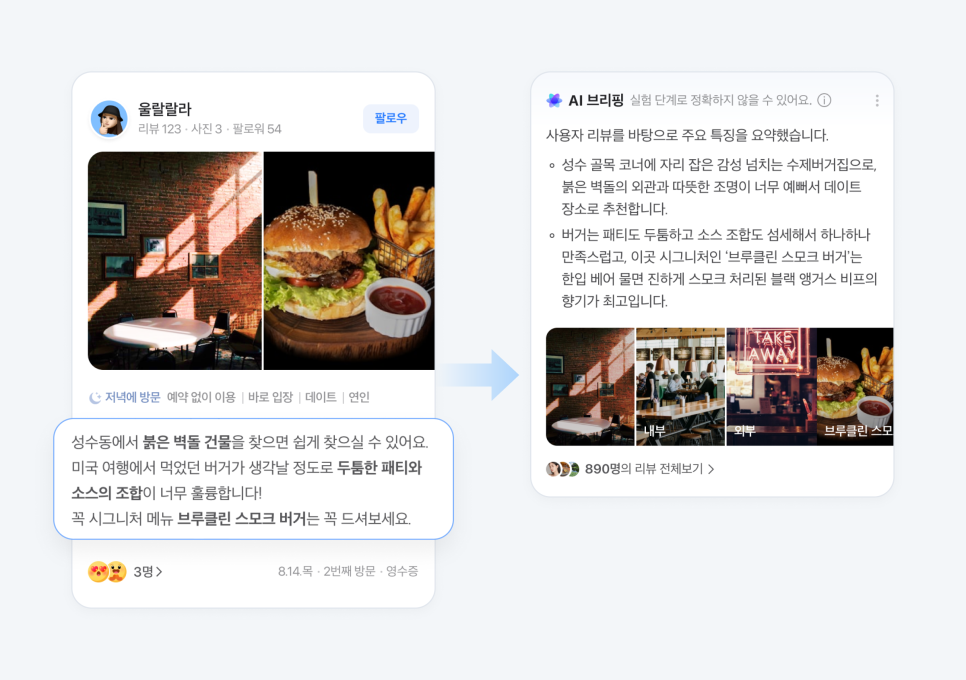 예를 들어, 성수동에 있는 수제버거집을 검색하면 다음과 같은 정보를 AI가 요약해서 알려줍니다.