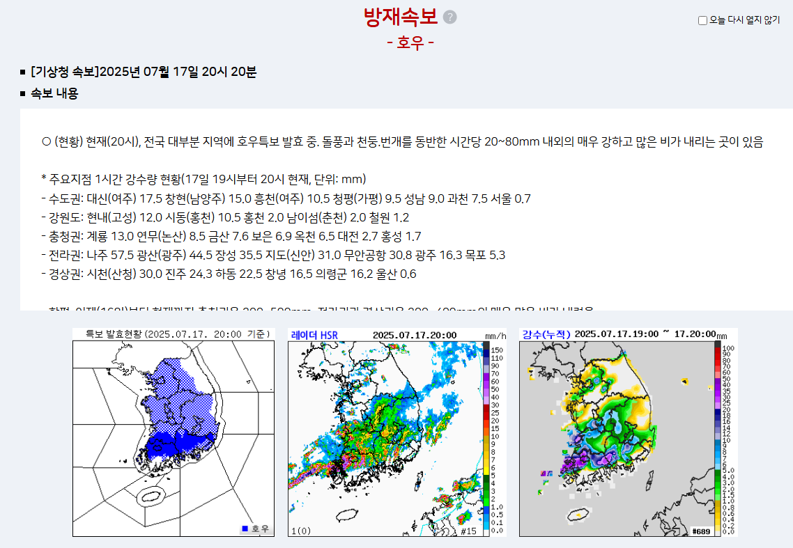 📌 즉, 남부지방은 장마전선이 아닌 ‘물폭탄’ 수준의 국지성 호우에 휩싸인 셈입니다.