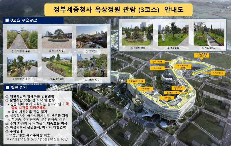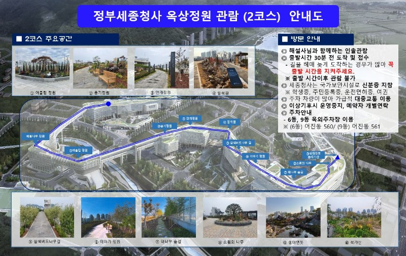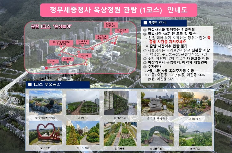 정부세종청사 옥상정원을 관람하려면 사전 예약이 필요합니다. 관람은 하루 3회 진행되며, 각 회차는 약 90분 동안 이루어집니다. 이 관람은 세종시의 문화관광해설사와 숲 해설자의 인솔로 진행되어 정원에 대한 다양한 설명을 들을 수 있어 더욱 의미 있는 시간을 보낼 수 있습니다.