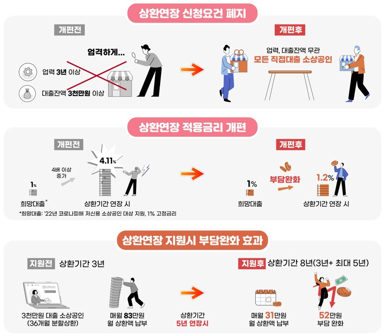 - 상환기간 연장: 이용 중인 직접대출 잔여 상환기간에 최대 5년(60회)을 추가.