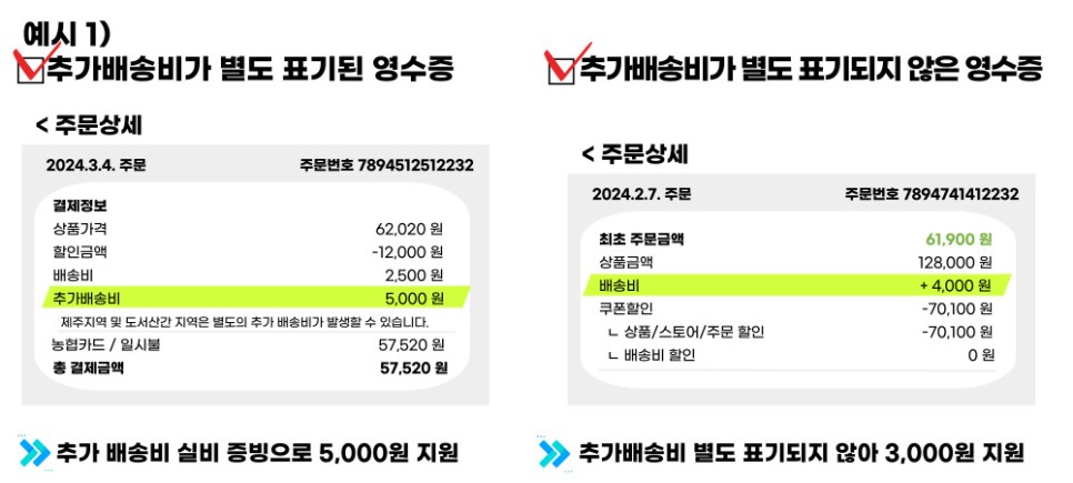 * 추가배송비가 별도 표기되지 않은 경우 3,000원 내 지원 - (신청대상) 2024. 1. 1일 이후 택배서비스 이용 시 추가배송비 결제 건