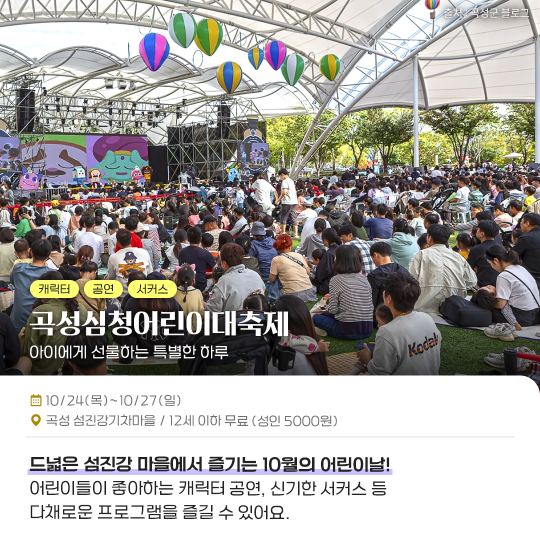 10월의 어린이날, 곡성에서 열리는 심청어린이대축제는 섬진강 마을에서 펼쳐지는 특별한 어린이 축제입니다. 아이들이 좋아하는 캐릭터 공연부터 신기한 서커스 쇼까지 다채로운 프로그램이 준비되어 있어 가족 모두가 즐길 수 있습니다. 시원한 가을바람과 함께 온종일 즐길 수 있는 이번 축제에서 아이들의 웃음소리가 끊이지 않을 거예요!