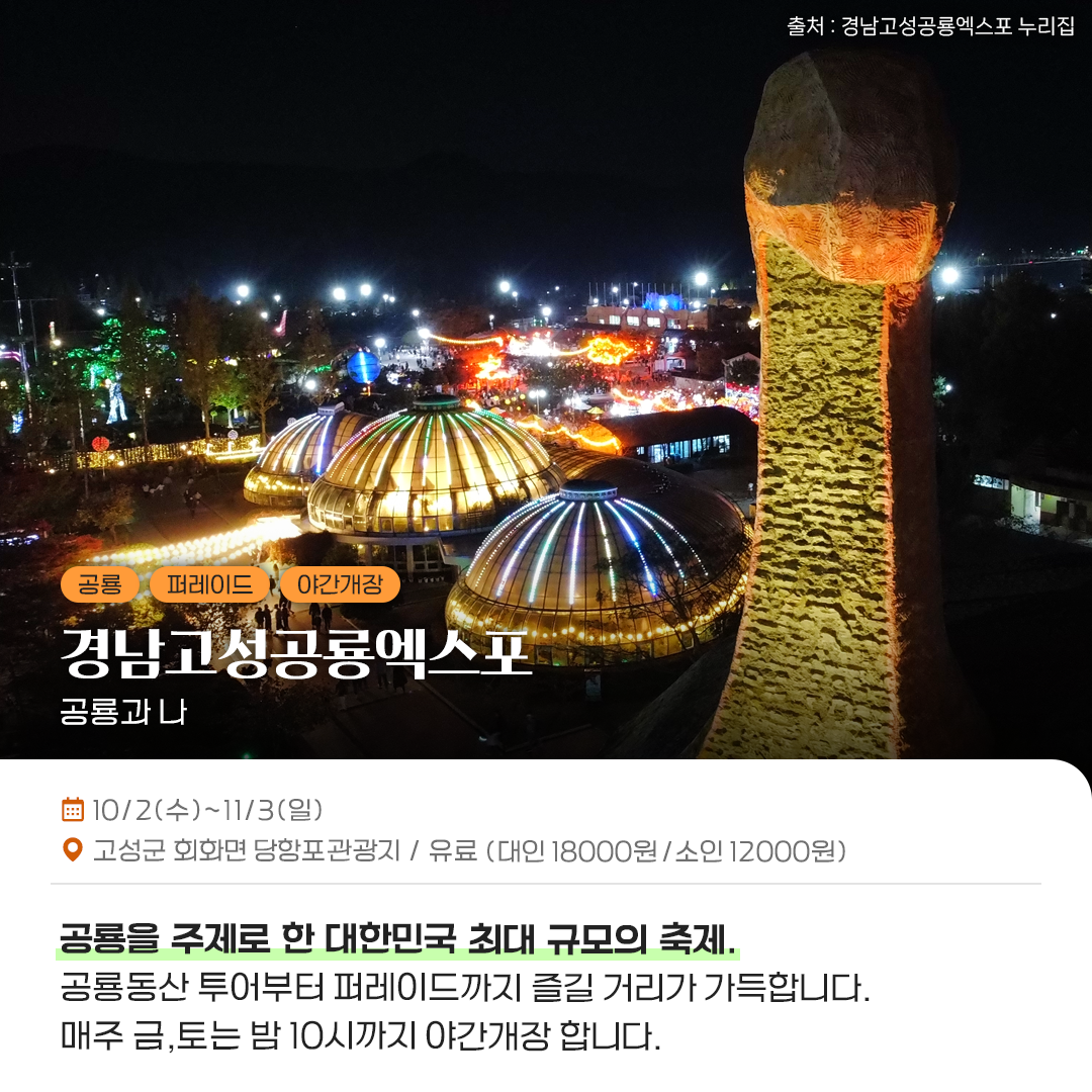 대한민국 최대 규모의 공룡 축제, 경남고성공룡엑스포에서 여러분을 기다립니다. 공룡동산 투어부터 퍼레이드까지, 남녀노소 모두가 즐길 수 있는 다양한 프로그램들이 준비되어 있습니다. 매주 금요일과 토요일에는 야간개장이 되어 밤늦게까지 공룡과 함께하는 모험을 즐길 수 있어요. 아이들은 물론이고 어른들도 즐길 수 있는 공룡의 세계로 여러분을 초대합니다.