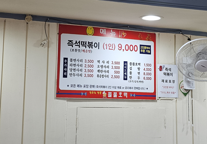 쫄쫄호떡을 기다리기 어려우신 분들은 실내에 들어가서 떡볶이를 주문하면 쫄쫄호떡을 기다리지 않아도 됩니다. 떡볶이는 2인부터 주문이 가능하며 1인분에 9,000원입니다. 맛은 보통맛과 매운맛이 있는데 보통맛을 먹어도 매콤하답니다. 실내에는 빈 자리가 많아서 바로 앉아서 먹을 수 있어요. 떡볶이 가격은 저렴하지 않아서 호떡만 주문하는 사람들이 대부분입니다.