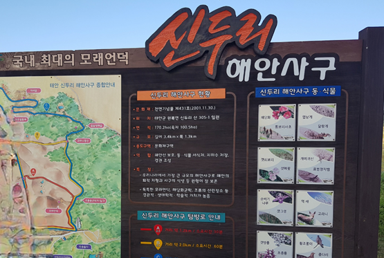 태안해안국립공원 내에 위치한 신두리해안사구는 태안해안도로 1코스 바라길의 일부로 자연을 사랑하는 사람은 물론 일반 방문객도 쉽게 접근할 수 있다. 신두리사구센터에서는 사구의 역사와 생태를 알아볼 수 있어 특히 초등학생을 동반한 가족들에게 귀중한 체험 학습 기회를 제공합니다.