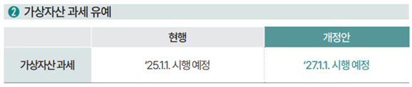 내년부터 시행될 예정이었던 가상자산 과세는 2027년까지 2년 유예됩니다. 이는 투자자 보호와 시장의 불공정 거래 행위를 규율하는 가상자산이용자보호법의 시행 성과를 점검할 필요가 있다는 이유에서입니다. 가상자산 과세는 이미 두 차례 연기된 바 있으며, 이번 유예로 인해 당분간 시행되지 않게 되었습니다.