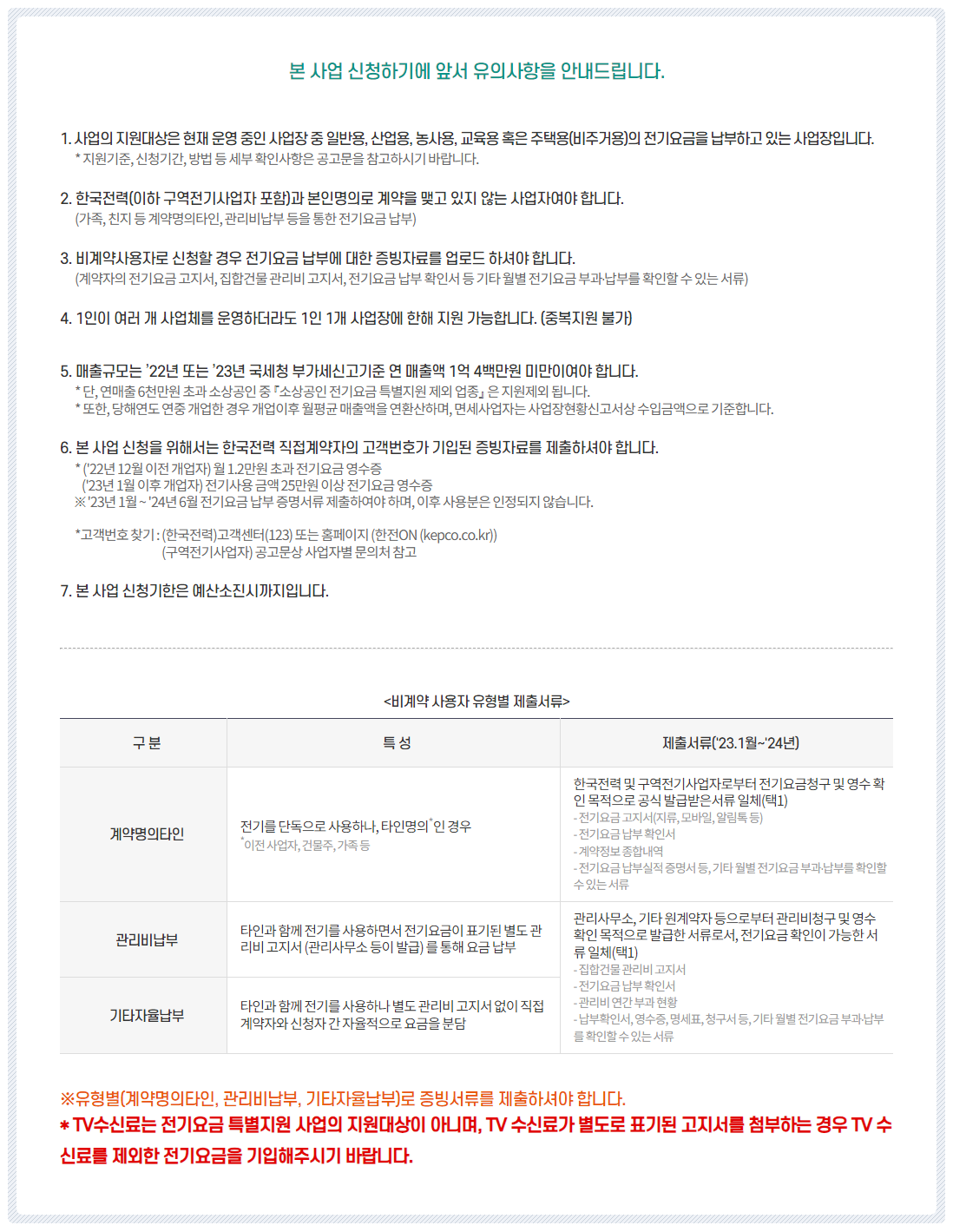 신청 시 필요한 서류로는 사업자 등록증, 전기 사용 내역서 등이 있을 수 있으니 미리 준비해두세요.