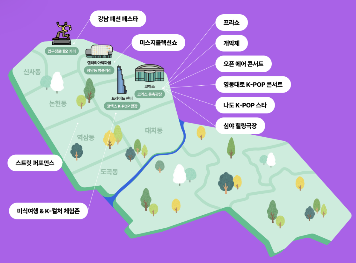강남페스티벌은 강남의 트렌디한 문화와 전통을 아우르며, K-POP, 패션, 미식 등 다양한 문화 콘텐츠를 통해 강남의 매력을 선보입니다.