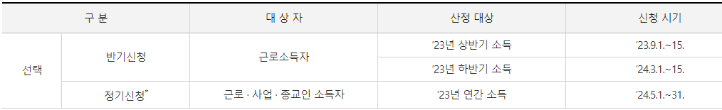 근로소득만 있는 자는 반기신청과 정기신청을 선택하여 신청할 수 있고, 사업, 또는 종교인 소득이 있는 자는 정기신청을 하셔야 합니다..