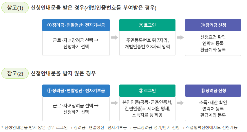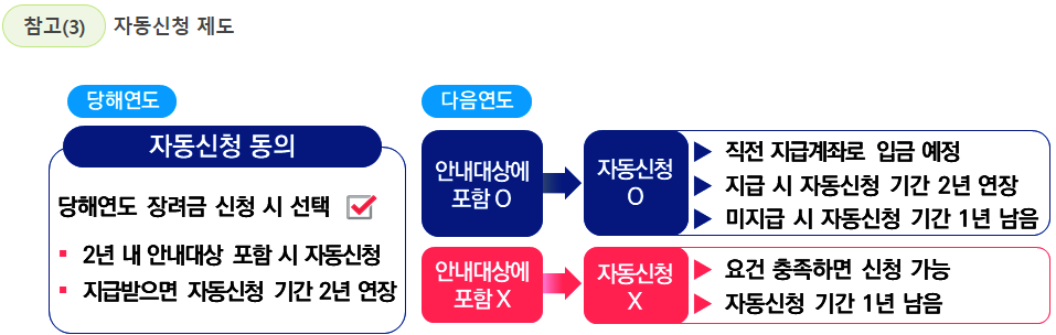 - 자동신청 제도: 60세 이상 고령자 및 중증장애인이 장려금 신청기간에 동의하면, 향후 2년 내 신청안내 대상 포함 시 자동으로 신청