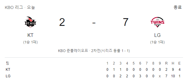 이로써 LG 트윈스와 KT 위즈는 1승 1패로 균형을 이루며 준플레이오프 3차전을 위해 수원 KT위즈파크로 이동하게 됩니다. 5전 3승제로 진행되는 이번 준플레이오프에서 양 팀 중 먼저 3승을 달성한 팀은 플레이오프에 진출해 정규 시즌 2위 팀인 삼성과 맞붙게 됩니다.