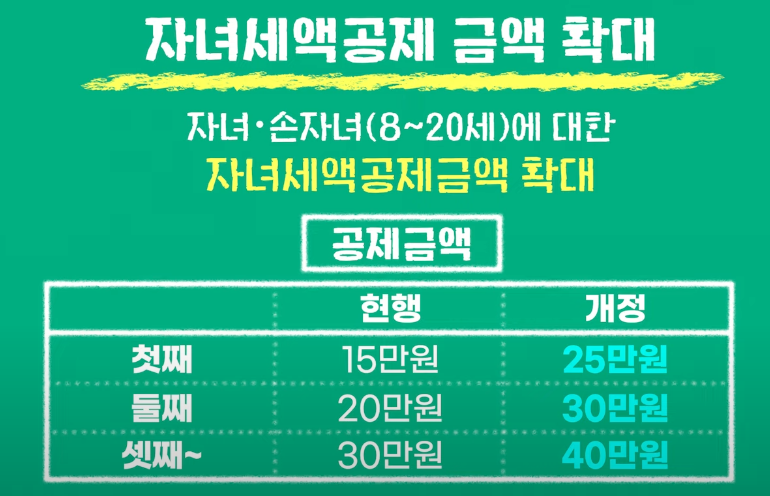 아이를 낳고 키우는 가족을 위한 혜택도 확대되었어요. 8세에서 20세의 자녀 또는 손자가 있는 사람에게 지원하는 자녀 세액공제 금액도 크게 늘어났습니다. 첫째 자녀는 기존 15만 원에서 25만 원, 둘째는 20만 원에서 30만 원, 셋째는 30만 원에서 40만 원으로 각각 10만 원씩 공제 혜택이 늘어났어요. 이를 통해 많은 가족이 추가 혜택을 받게 될 것입니다.