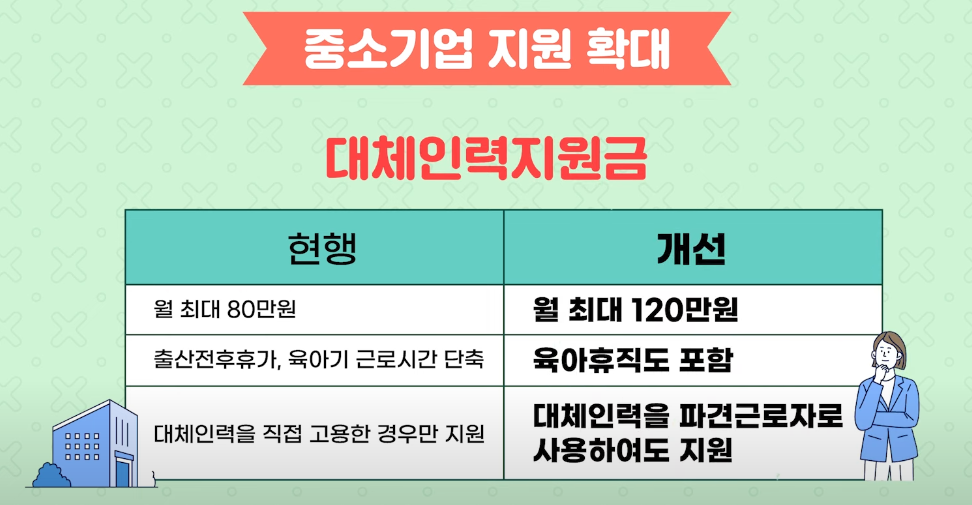 또한, 중소기업에서는 육아 휴직 대체 인력 채용 지원금을 월 최대 80만 원에서 112만 원으로 인상하고, 출산 휴가나 유아기 근로시간 단축에 대한 대체 인력 지원금을 육아 휴직까지 확대합니다. 이로 인해 기업의 부담도 줄어들고, 더 많은 근로자가 육아 휴직을 사용할 수 있게 될 거예요.