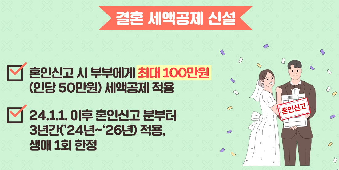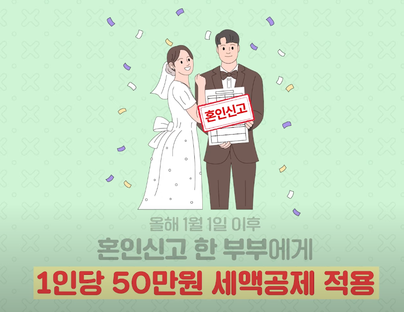 결혼을 망설이는 이유 중 하나는 바로 높은 비용 때문입니다. 이를 해결하기 위해 정부는 결혼을 장려하기 위한 세제 인센티브도 마련했어요. 우선, 2024년 1월 이후 혼인 신고를 한 부부에게는 1인당 50만 원의 세액공제 혜택을 제공합니다. 만약 부부 모두 소득세를 납부하는 경우라면 최대 100만 원을 공제받을 수 있어요. 이 혜택은 2026년 말까지 한시적으로 적용되며, 생애 한 번 받을 수 있는 기회입니다.